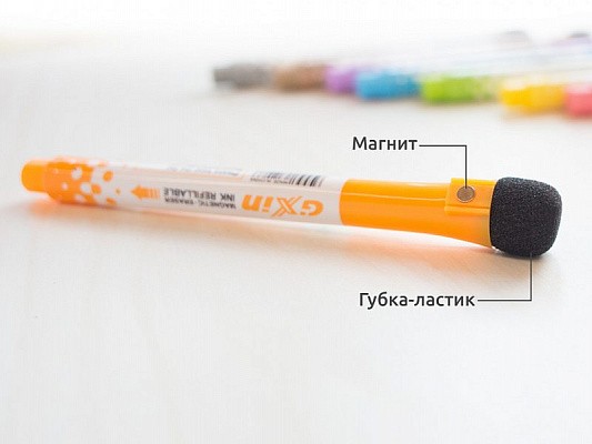 Корпус маркера дополнен магнитом для крепления на магнитную маркерную доску и любые другие металлические поверхности. На колпачке есть губка-ластик для легкого удаления маркера с доски.